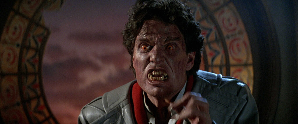 Az író-rendező Tom Holland a klasszikus horror-motívumokat vizuális szempontból többek között azzal szerette volna modernizálni, hogy a legújabb latexeffektek segítségével ad élt a természetfelettinek. Ez olyannyira sikerült, hogy Evil halála (35 éves spoiler), a praktikus effektek kíméletlenségének és kidolgozottságának, illetve McDowall és Geoffreys színjátszásának köszönhetően lett az évtized egyik legtragikusabb jelenete (Becéző szavak elmehet a…). Persze ez csak egy példa: a Fright Night az időszak effekt-művészetének egyik csúcspontja, ahol szinte jelenetről jelenetre talál magának valami lenyűgözőt a horrorrajongó.