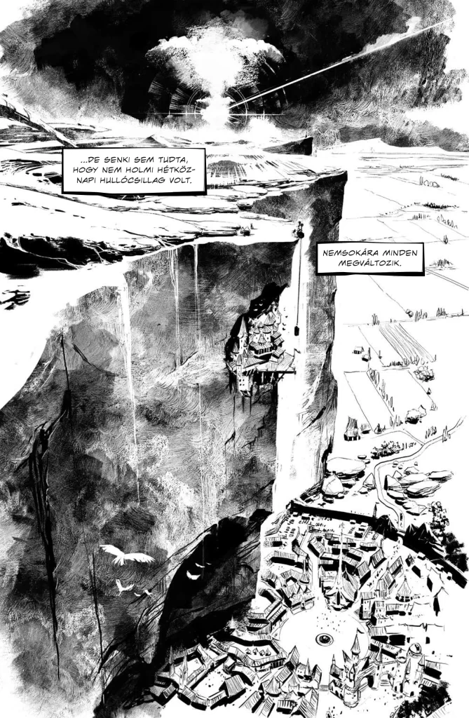 A Mezsgye talán kicsit kemény diónak is érződhet töménysége és meglehetősen laza cselekményszövése miatt. A prológussal együtt háromfejezetes kötet leginkább epizodikus szerkesztésű, ahol a szakállas Kane és a botcsinálta lovag Tomek szemein keresztül kaphatunk bepillantást Kamberg városának groteszk mindennapjaiba. Ahol egy csápszörny simán ellophatja a bablevesedet, a város körül lebegő telepaták („azok a repülő seggfejek”) váratlanul felrobbantják két tucat ember fejét és a város tejhatalmú ura Kaiser Hannibal (akinek orra sincs) saját bejáratott minihadseregét küldi a városi összképet elcsúfító óriáspók ellen. Mintha a Robert E. Howard-i fantasyponyva találkozna a Korongvilág fekete humorával nyakon öntve egy adag kozmikus horrorral (egy-két dizájn már-már Gigeri szintű elborulás). Ha ez még nem hozná meg a kedvet az elolvasásra, akkor erre a vadul örvénylő stíluskavalkádra a pontot Kovács Péter briliáns képi megvalósítása teszi fel. A helyenként szinte experimentálisan laza kontúrokkal, de legtöbbször hátborzongató részleteségű monokróm látványvilág tökéletesen illeszkedik ehhez a történethez, amiben fantasztikum, borzalom, természetfölötti csoda és a mindennapos büdös valóság keveredik egymásba. Szinte az oldalakon keresztül érzed a vér, a rothadás, a szörnyek és a félig középkori közeg bűzét (ilyen átható erejű esztétikumot régi szovjet filmekben szoktam látni). Ez a karcos, piszkos és szárnyaló alkotói fantáziától tanúskodó művészi látásmód, ami inkább az európai képregénykör sajátja, mint az amerikaiaké. A Mezsgye pedig egy rendkívül bíztató lépés afféle, hogy végre mi magyarok is tudjuk magunkat valamivel képviselni. Az elmúlt hónapok egyik legkellemesebb meglepetése, csak ajánlani tudom és remélem az alkotótriásznak lesz lehetősége a folytatásra.