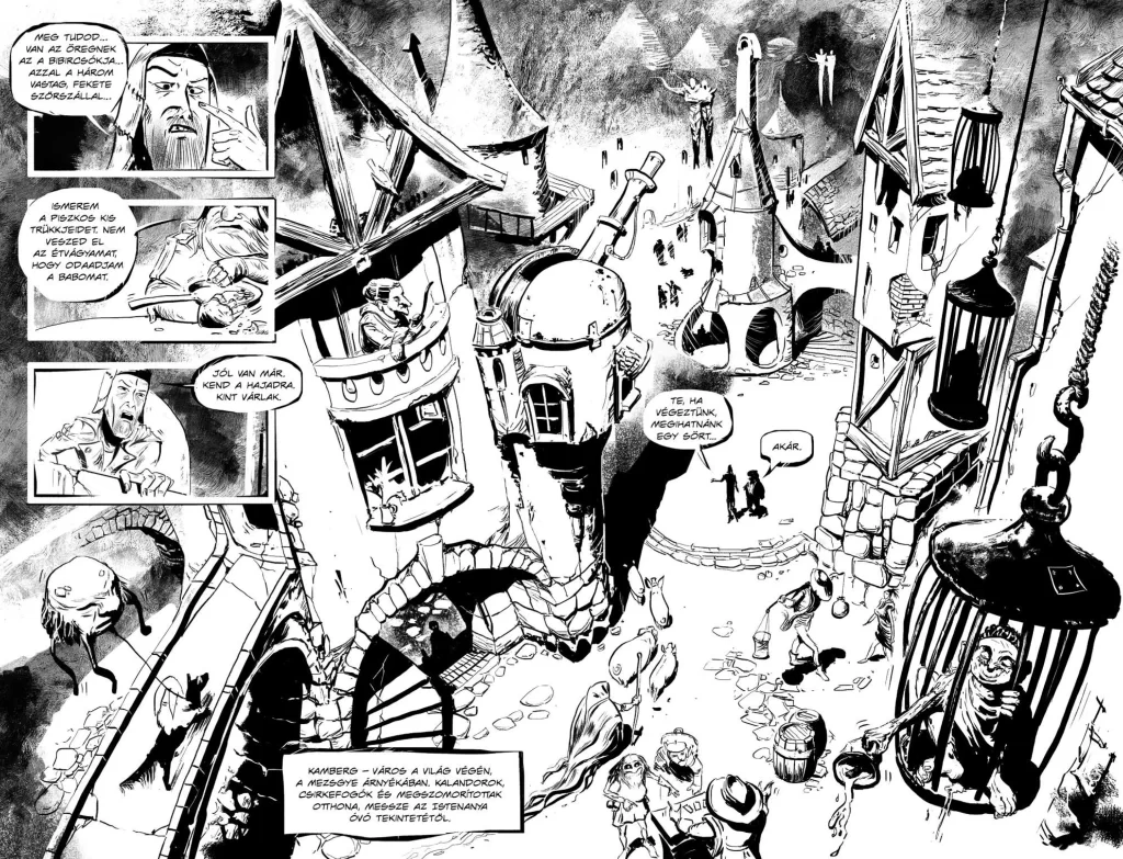 A Mezsgye talán kicsit kemény diónak is érződhet töménysége és meglehetősen laza cselekményszövése miatt. A prológussal együtt háromfejezetes kötet leginkább epizodikus szerkesztésű, ahol a szakállas Kane és a botcsinálta lovag Tomek szemein keresztül kaphatunk bepillantást Kamberg városának groteszk mindennapjaiba. Ahol egy csápszörny simán ellophatja a bablevesedet, a város körül lebegő telepaták („azok a repülő seggfejek”) váratlanul felrobbantják két tucat ember fejét és a város tejhatalmú ura Kaiser Hannibal (akinek orra sincs) saját bejáratott minihadseregét küldi a városi összképet elcsúfító óriáspók ellen. Mintha a Robert E. Howard-i fantasyponyva találkozna a Korongvilág fekete humorával nyakon öntve egy adag kozmikus horrorral (egy-két dizájn már-már Gigeri szintű elborulás). Ha ez még nem hozná meg a kedvet az elolvasásra, akkor erre a vadul örvénylő stíluskavalkádra a pontot Kovács Péter briliáns képi megvalósítása teszi fel. A helyenként szinte experimentálisan laza kontúrokkal, de legtöbbször hátborzongató részleteségű monokróm látványvilág tökéletesen illeszkedik ehhez a történethez, amiben fantasztikum, borzalom, természetfölötti csoda és a mindennapos büdös valóság keveredik egymásba. Szinte az oldalakon keresztül érzed a vér, a rothadás, a szörnyek és a félig középkori közeg bűzét (ilyen átható erejű esztétikumot régi szovjet filmekben szoktam látni). Ez a karcos, piszkos és szárnyaló alkotói fantáziától tanúskodó művészi látásmód, ami inkább az európai képregénykör sajátja, mint az amerikaiaké. A Mezsgye pedig egy rendkívül bíztató lépés afféle, hogy végre mi magyarok is tudjuk magunkat valamivel képviselni. Az elmúlt hónapok egyik legkellemesebb meglepetése, csak ajánlani tudom és remélem az alkotótriásznak lesz lehetősége a folytatásra.